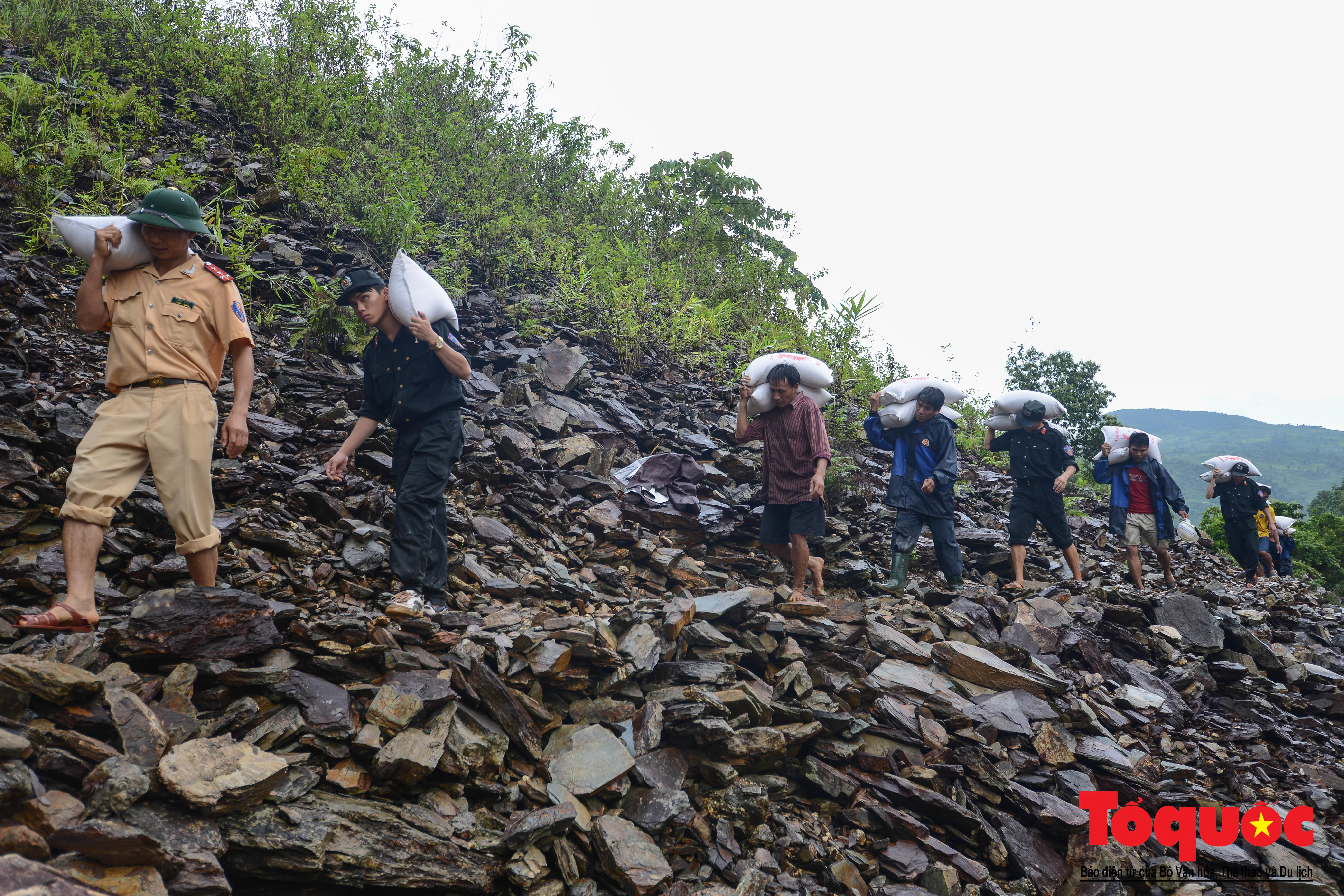 Hơn 50 cán bộ chiến sĩ công an tỉnh Điện Biên và Tuần Giáo gùi gạo để băng qua đập thủy điện xuống thuyền.