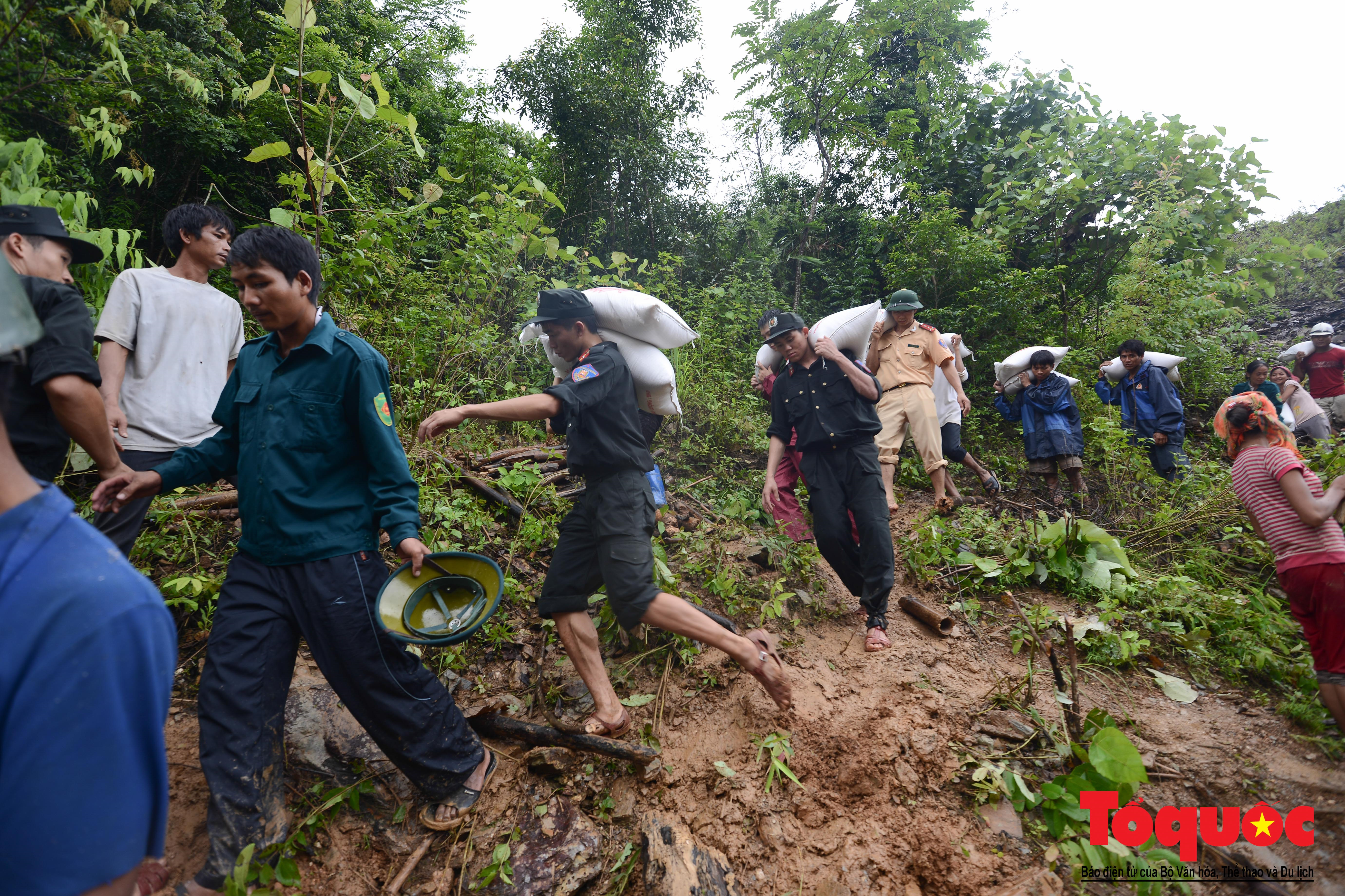 Lực lượng công an tỉnh Điện Biên lội suối, băng rừng vác các bao tải lương thực nặng tới tay người dân ở các xã bị cô lập do trận mưa lũ hôm 1/8/2015.